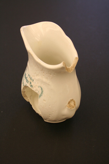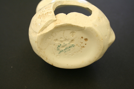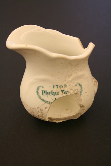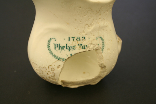 Small white ceramic cream pitcher. Wide mouth. Printed on one side "1782/Phelps Tavern/(illegible)" Part of design missing. Maker's stamp on bottom but partially missing on "New York" legible.