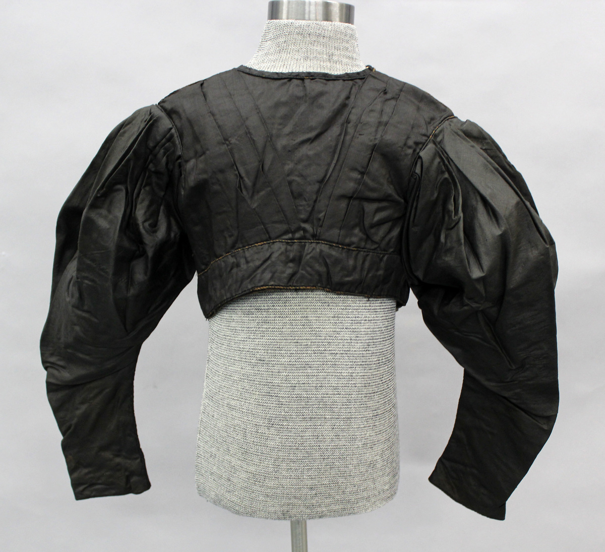 Black silk child's bodice; fastenings down back with hooks and eyes; scoop neck; long gathered full sleeves; V'd front with three vertical tucks on each side; waistband with two hooks and eyes at back; princess seams at back; piping along waistband, and armscye; body lined in white cotton; sleeves lined with plaid cotton; waistband lined in brown glazed cotton; all hand-stitched