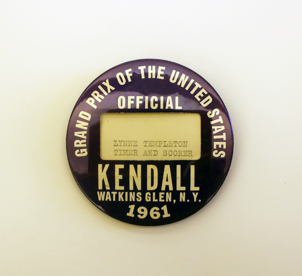 Round metal button with pin and catch on reverse. Paper front with blue background and white lettering, "GRAND PRIX OF THE UNITED STATES/OFFICIAL/KENDALL/WATKINS GLEN, N.Y./1961." Rectangular cutout in paper front, showing paper insert with black lettering, "LYNNE TEMPLETON/TIMER AND SCORER." Silver metal reverse with openings for paper insert.