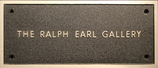 Black rectangular metal wall sign. "THE RALPH EARL GALLERY" in raised silver letters across center. Hole in each corner where sign would have been attached to the wall.