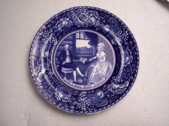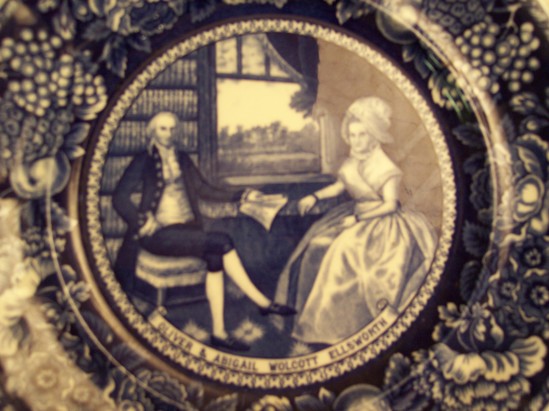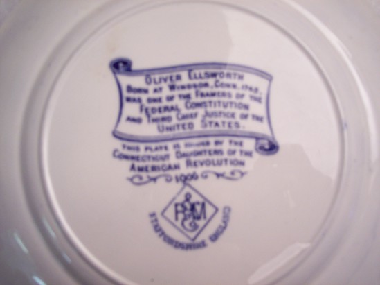 Blue and white ceramic plate. Outside edge is decorative fruit and floral border. Seal at top "Daughters of the American Revolution" Center of plate has reprint of Ralph Earl painting of Oliver and Abigail Wolcott Ellsworth. Banner underneath image identifies portrait. On back of plate is banner describing accomplishments of Oliver Ellsworth. Underneath "This plate issued by the Connecticut Daughters of the American Revolution 1906"
