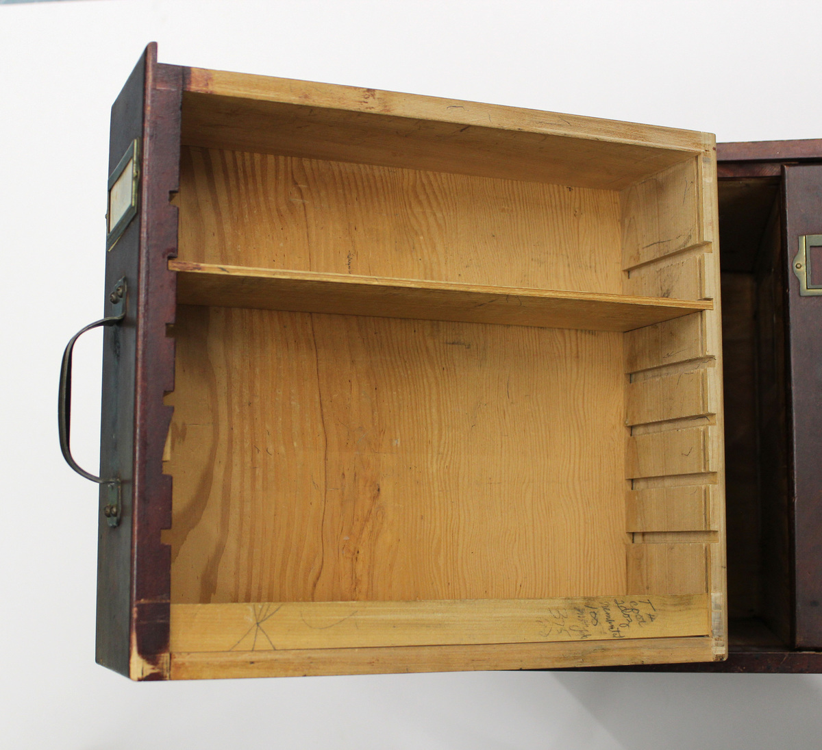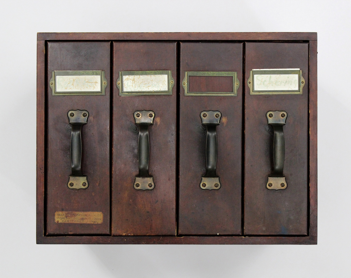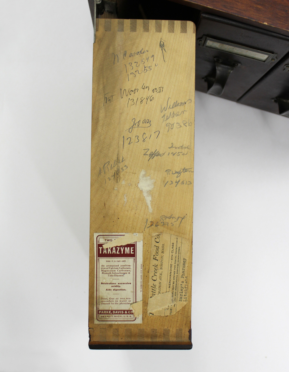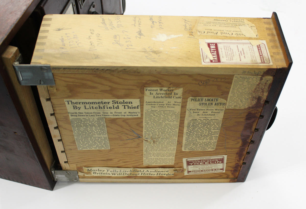 Square apothecary or pill drawers used in Murphy's Pharmacy, Litchfield, CT. Wooden box formed at top, bottom, and sides of 1/2" thick wood board, joined at edges with finger joints. Back of box made of a wood board attached at interior. Four vertical drawers inserted into box. Each drawer is attached by a metal hinge to a vertical piece of wood that slides on a simple interior track, allowing the drawers to be pulled fully out and rotated to left for easier access. Drawers have adjustable interior shelves, vertical metal drawer pulls, and metal framed for inserting a label. Exterior surface of box and drawers is stained a dark, rosewood color. Numerous newspaper articles, postcards, and product stickers are attached to the top and back of drawers. Customer names and account numbers written on the wood in pen and pencil. Manufacturer label at bottom of left-most drawer. Drawer units designed to be stacked.