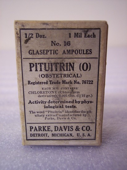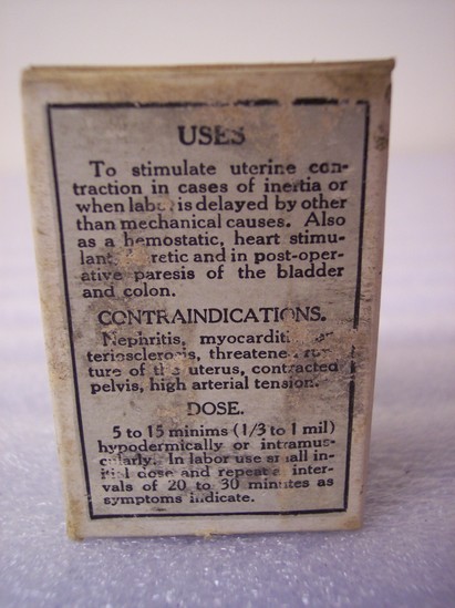 Light blue box with label on top. Inside six individual compartments stuffed with cotton dyed bright pink. Three brown glass ampules with lables. Box and ampules labeled "Ergot Aseptic"