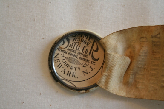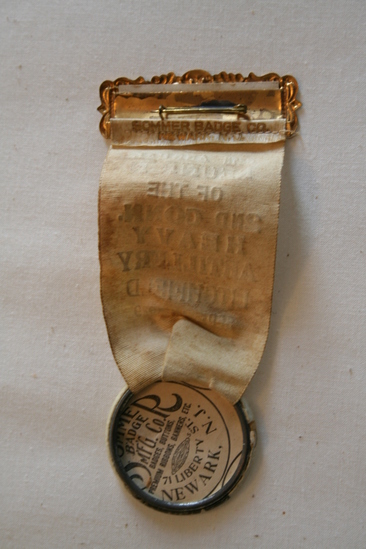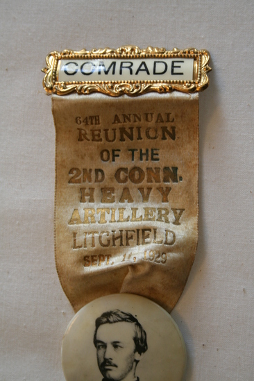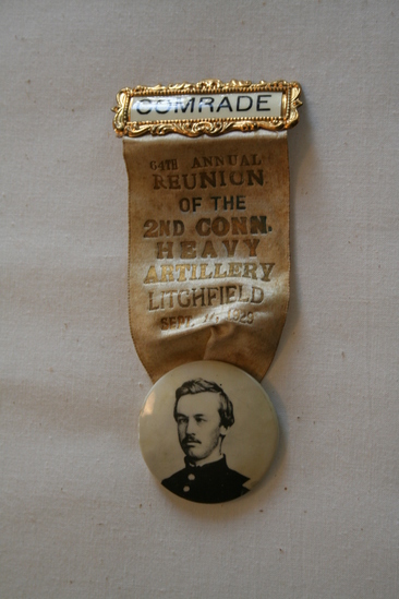 Rectangular pin with gold scrool border frame. In center of frame "COMRADE" printed in black on white enamel. White silk ribbon with gold lettering "64th Annual/Reunion/of the/2nd Conn./Heavy/Artillery/Litchfield/Sept. 11, 1929" Round button at bottom with picture of young man in uniform. Paper label on back of button "Sommer Badge Mfg. Co./Badges, Buttons,/Premium Ribbons, Banners, etc./71 Liberty St./Neward, NJ"