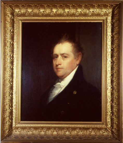 Oil on mahogany 1/4 length portrait of Oliver Wolcott, Jr. facing left, wearing a dark coat, brass buttons, white shirt and ruffled stock, blue eyes, brown with white receding hairline, in a peak atop head in front. Heavy gilt gesso frame of anthemion leaves, egg and dart inner border and deeply curved concave side.