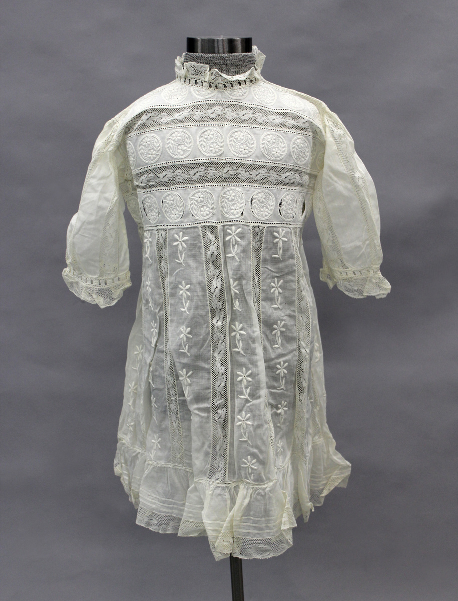 White sheer cotton child's dress; lace and embroidered insertions in bands; ruffled collar; long full sleeves with lace ruffle cuffs; beading trim at neck and cuffs for ribbon insertion; six buttons with loop closures in back; flounce ruffle at bottom with tucks and lace; all hand-stitched