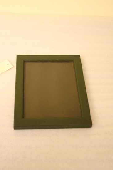 1" heavy wood frame, painted green, enclosing several sheets of glass for a 3-D effect. Image on glass of man with a camera. Screw eyes in top of frame