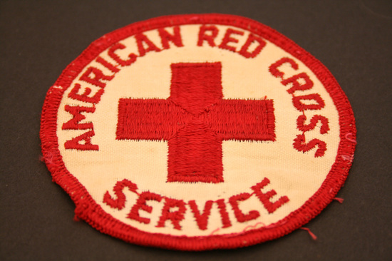 Circular patch, white with red border and "American Red Cross/Service" in red with red cross symbol in center.
