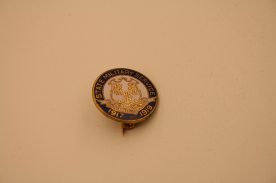 Gold plated pin with blue and white enamel; gold state shield on white center with "State Military Service 1917-1919" in gold on blue.