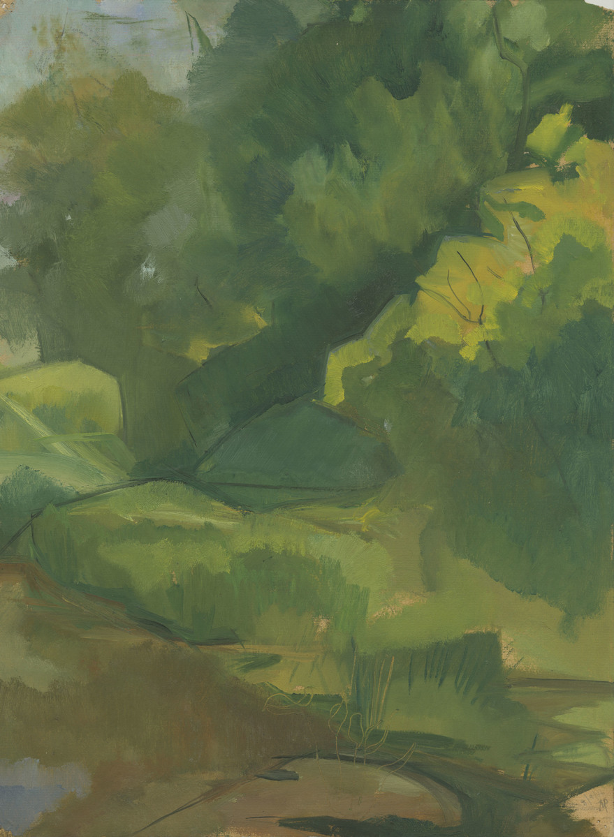 Oil and acrylic on paper landscape painting. A patch of sky in light blue, white and light purple is visible on the top left hand corner of the paper. The top half of the painting is covered in trees of varying shades of green. The bottom half of the painting is covered in grass and similar plant life in varying shades of green. There is a brown and green pond in the bottom left hand corner with patches of light blue to represent a reflection of the sky. Initialed and dated "8/9/49" in pencil on the bottom right hand corner.
