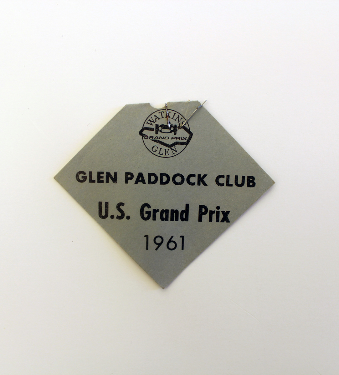 Diamond-shaped paper pass for the U.S. Grand Prix. Grey cardstock with black printed lettering, "GLEN PADDOCK CLUB/U.S. Grand Prix/1961," underneath logo of Watkins Glen International race track.