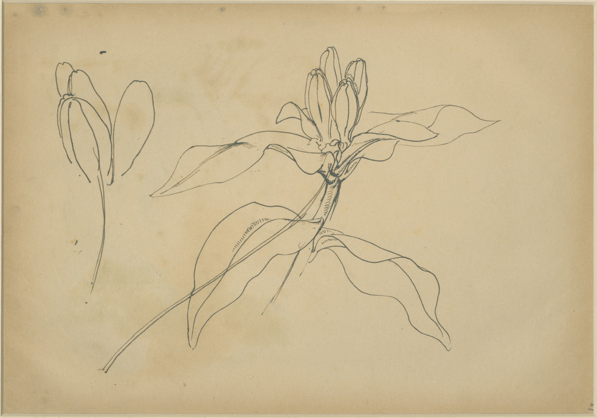 Pen and ink drawing of a lily flower. The central lily has a stem and is much more detailed compared to the sketch of a portion of the lily flower to the left hand side. There is a number in pencil in the bottom right hand corner of the sketch, however it is obscured by the matboard and is thus indiscernible. Matted, no date.