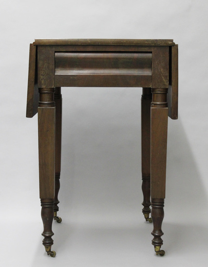 Empire table, drop leaf on two sides. Drawers on front. Block legs turned at bottom. Brass casters.