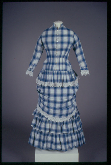 Material of light cotton printed with blue and white plaid with light brown lines A: Bodice - long waisted with two gores each side of the 12 pearl buttons; the neck has a simple small collar and th long straight sleeves have gathered cuffs trimmed with machine made lace; the bodice has an added skirtlet or ruffle along bottom hem which is pleated all around and trimmed with machine made lace B: Skirt - Long, column chaped with three wide bands of like material gathered around the bottom; ties on back sides of skirt to gather it into bustle on the back; tiered ruffles at bottom of skirt D: Bustle - half skirt length; fits around waist; ties sewn into fabric to gather bustle in back and attach to skirt;