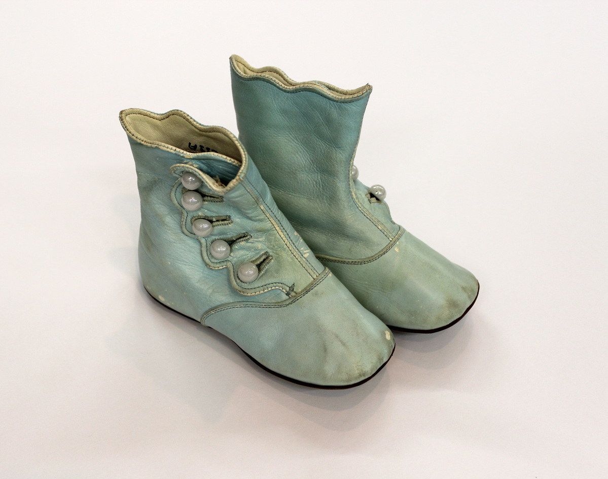 Pair of blue leather child's shoes/boots; scalloped edge at side opening and along top; ankle-height; five buttonholes and buttons on side; white cotton twill lining; white leather lining along inside top; tan leather bottoms; markings inside: "4E 69273/94" in both; illegible imprinted letters on bottoms