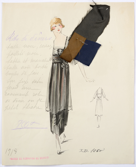 Lithograph and watercolor on paper fashion design. Dinner dress of black tulle with an over blouse of spangled black. Embroidered with jet beads on the tulle sleeves. Worn over black satin skirt. Fabric samples accompany rendering.