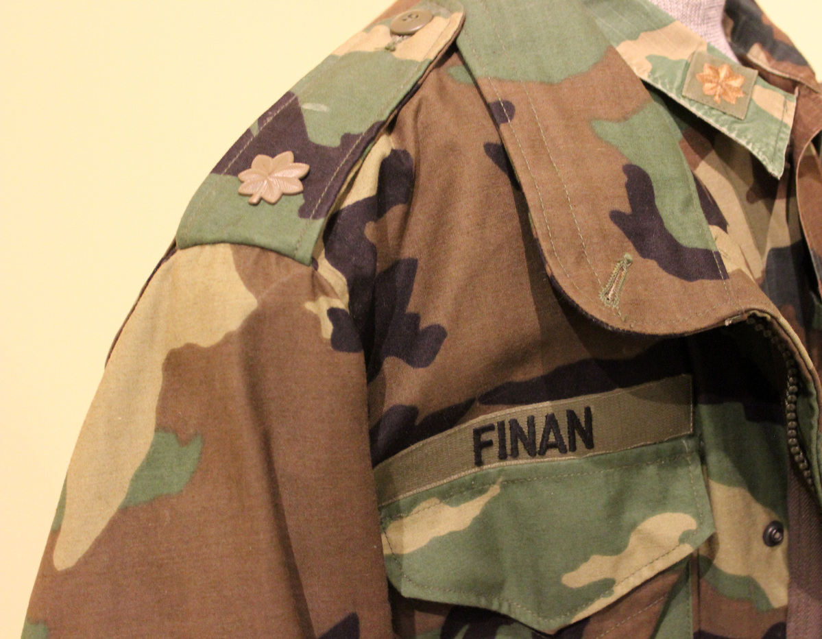 U.S. Army Battle Dress Uniform (BDU). Camouflage jacket (a) with spread collar with buttonholes. Front placket with zipper and snaps. Long sleeves with Velcro. Two chest patch pockets. Epaulets with buttons on shoulders. Embroidered name at right side above pocket, "FINAN." Embroidered at left side above pocket, "U.S. ARMY." American flag patch on right sleeve. Printed label on interior with size, fiber content, and care instructions; listed as "Coat, Cold Weather: Field Camouflage Pattern." Camouflage blouse (b) with spread collar, long sleeves, front placket with buttons. Two chest patch pockets with buttons. Embroidered name above right pocket, "FINAN." Embroidered above left pocket, "U.S. ARMY." American flag patch on right sleeve. Printed label at center-back with illegible text. Small printed label at right-back.
