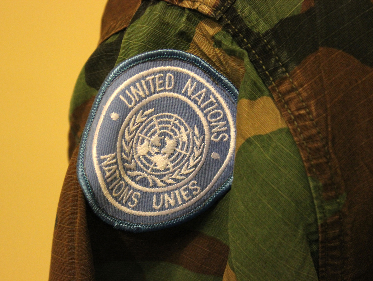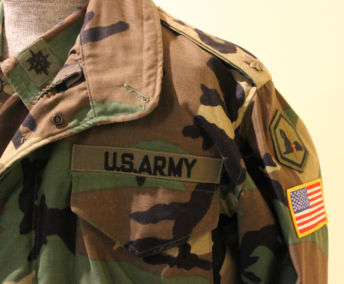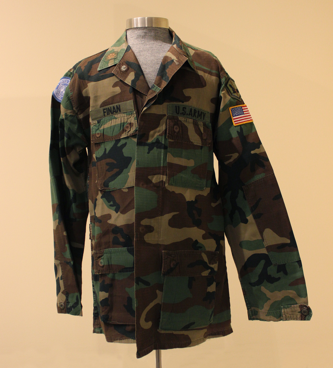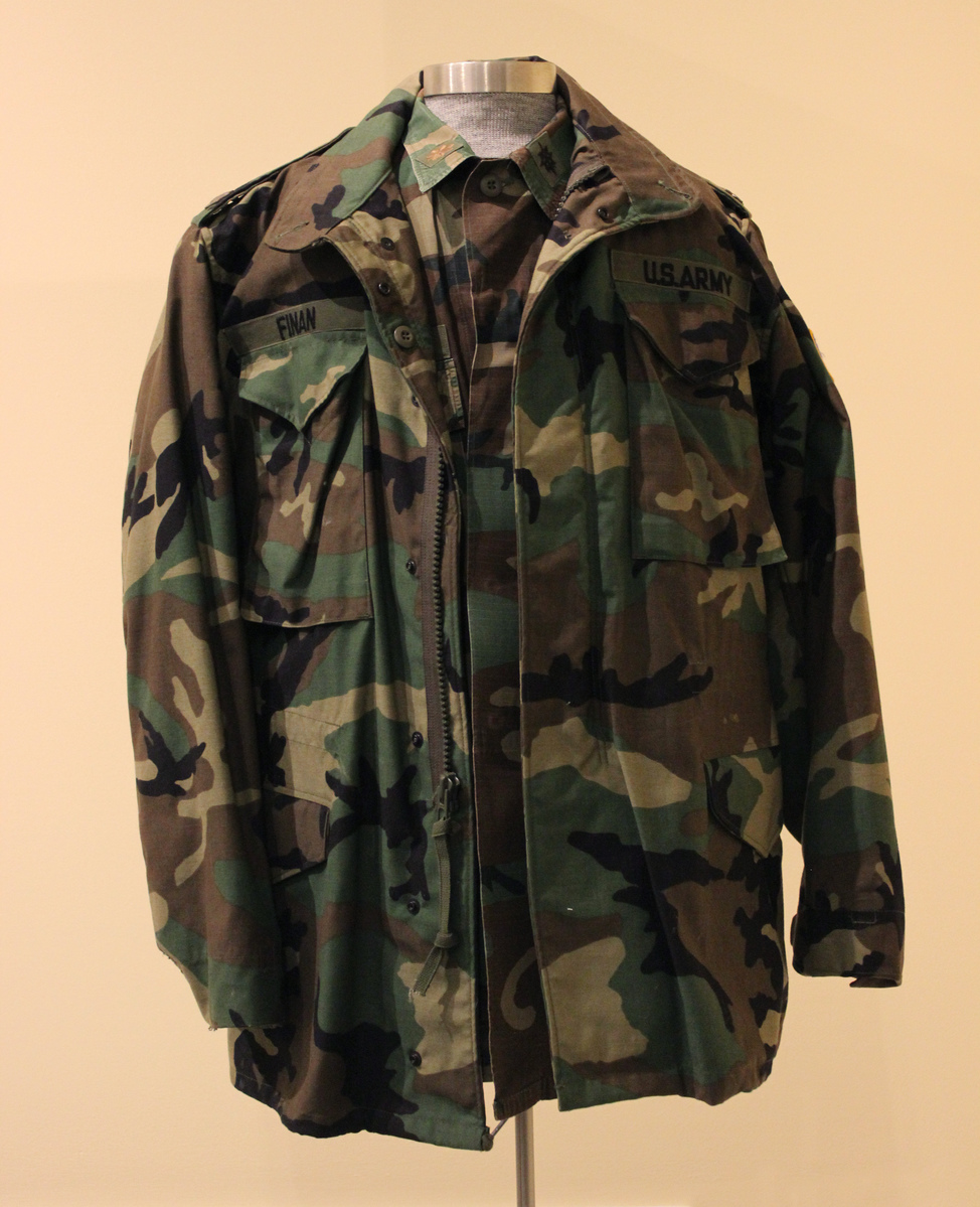 Worn by Brian Finan, b. Litchfield, who served in the Army from 1976 to 1994 and retired as a Major. Finan served as an undercover intelligence officer for most of his career. This uniform was worn during temporary duty in Macedonia (former Yugoslavia) in 1994. Finan's father, James Finan, served during World War II; his jacket is also in the collection (2020-42-2).