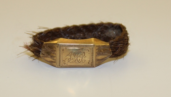Hair ring of braided brown hair, set in gold. Initialed "J.A.P." probably for Julia Anna Peck, daughter of Horace C and Julia Anna (Hayes) Peck who married in 1843 Charles Claudius Herrick on May 20, 1868