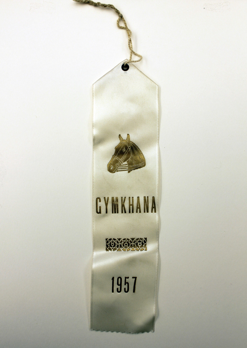 White satin ribbon with triangular fold and metal eyelet at top. Printed on one side in gold ink is image of a horse's head with lettering, "GYMKHANA/1957." White thread strung through eyelet.