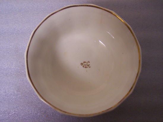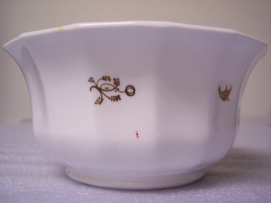 White slop bowl with 12-paneled body on a ring base. Bell flared. Gilt highlights the inner rim.
