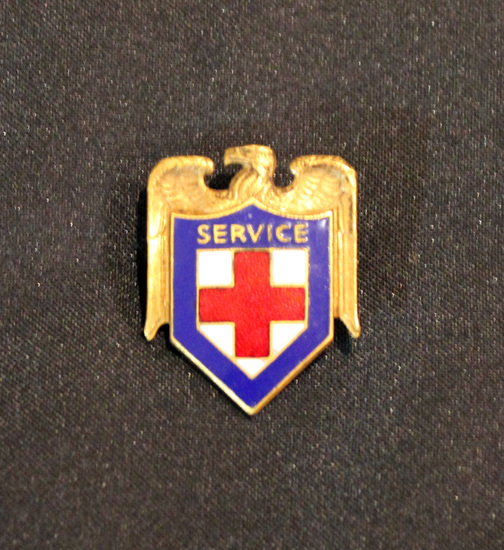 Gold pin shaped like an eagle with a shield in front of it. Shield decorated in enamel. Blue border around white field with red cross in center. "SERVICE" in gold across top or blue border.