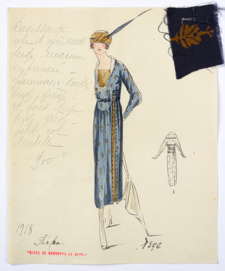 Lithograph and watercolor on paper fashion design. Afternoon dress. Beige on blue print with panels lined in beige with a collar of lace. Fabric samples accompany rendering.