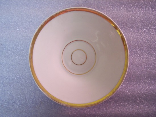 White saucer with a wide, gilt band on its edge, and two small thin circles in the center. Center is slightly indented for a teacup.