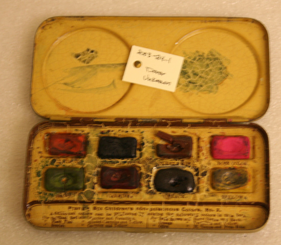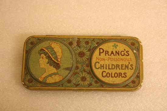 Metal case - green sunflower background. Two raised circles on lid. One has profile of young girl and other says "Prang's Non-Posionous Childrens Colors" Hinged lid. Inside are eight recessed squares for watercolor. Name of each color written underneath (top row) - Vermillion, Prussion Blue, Burnt Sienna, Rose Color (bottom row) - Green, Carmine, Black, Yellow. Instructions at bottom as to how to create other colors by mixing shades.