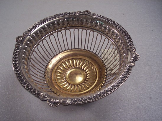 One of a pair of silver plated fruit baskets, circular baskets with open wire sides, rim with stamped leaf pattern border set off by four shells, sunburst pattern inside bottom which is gilt.