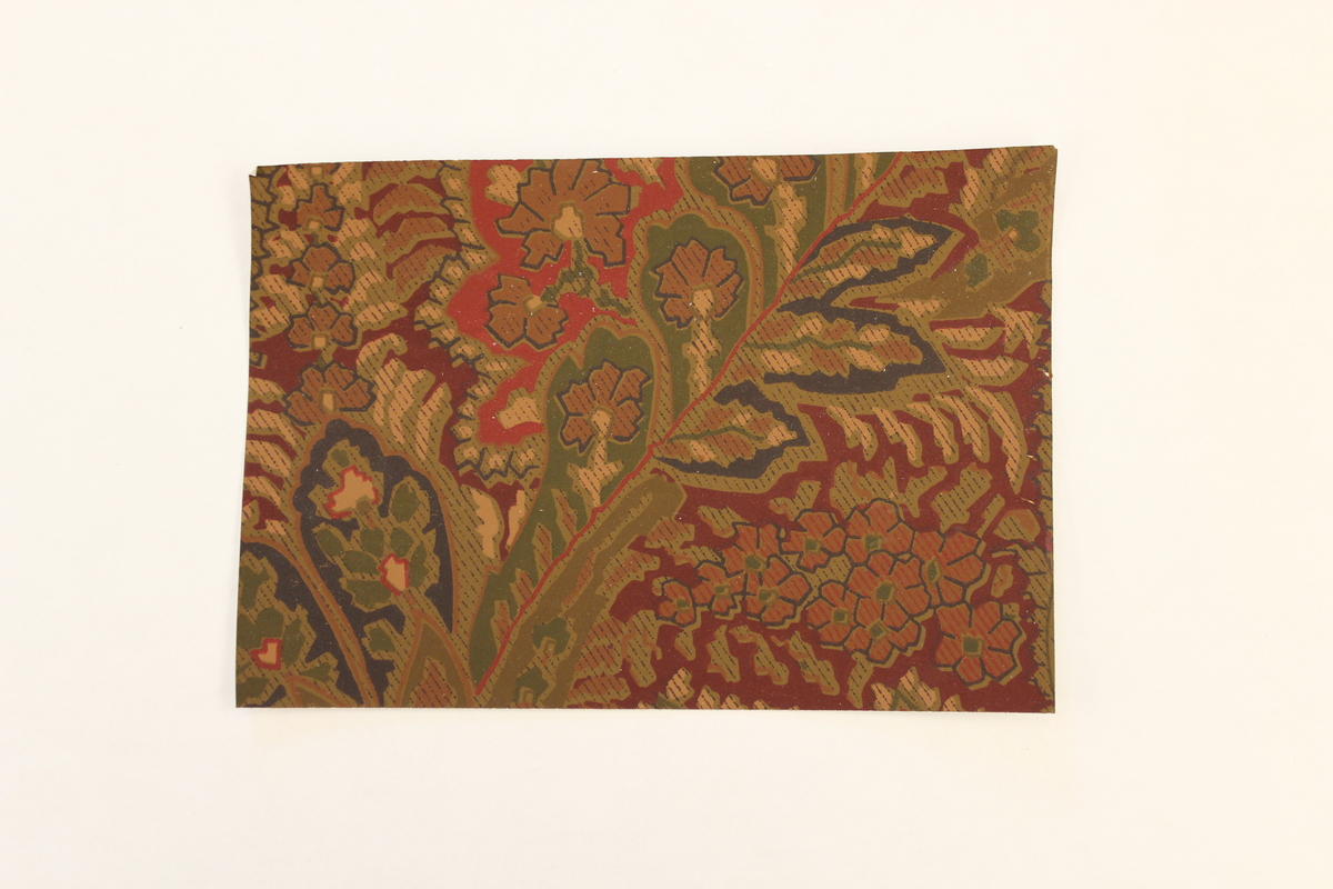 Rectangular wallpaper sample made of vinyl. Background is maroon with brown flowers. Large green, black and tan leaves of differing shapes and sizes surrounding the flowers. Wallpaper is matte and slightly ridged to the touch.
