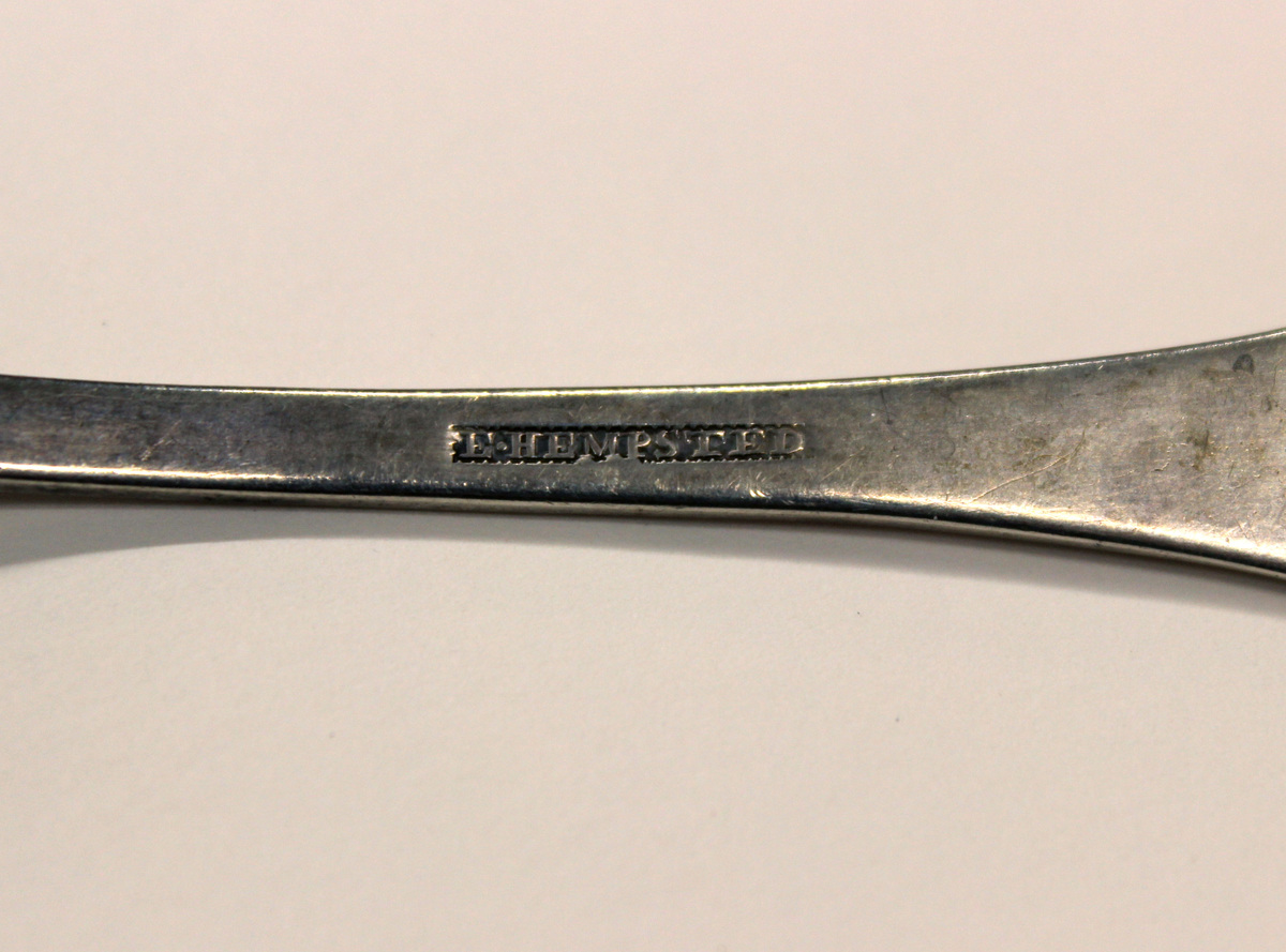 Elisha Hempsted (1796-1855), born in Hartford, worked as a silversmith and watchmaker in Litchfield from 1823 to 1855. He appears in an advertisement posted in the American Eagle on August 25, 1823, having "taken a shop a few rods west of the Court House."