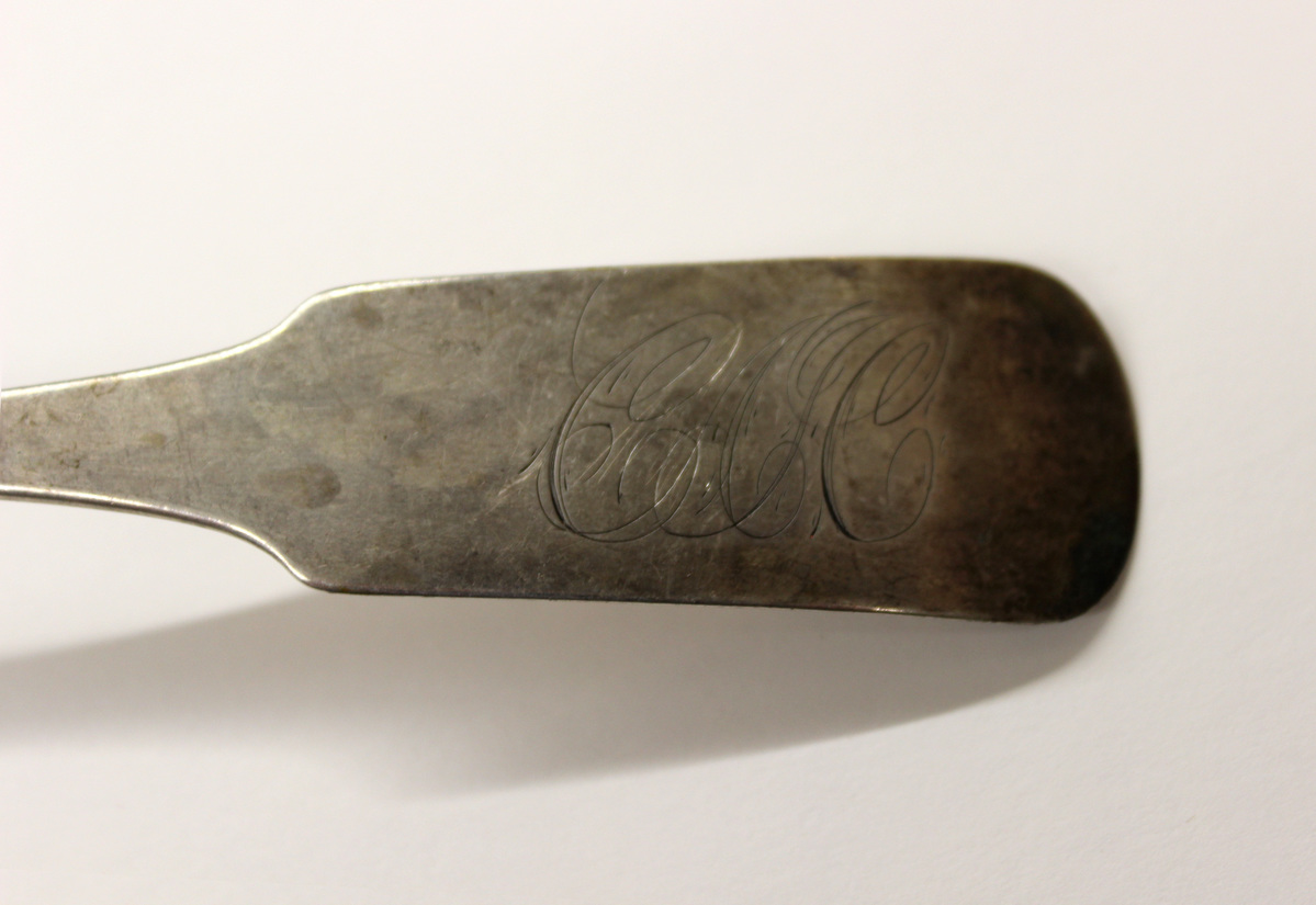 Serving spoon made for an unknown individual by Elisha Hempsted, a Litchfield silversmith. Coin silver spoon with deep, egg-shaped bowl and narrow stem that widens toward handle. Handle flares outward to form wide, rounded terminal. Engraved on handle, "CFC." Maker's mark on back of stem, "E. HEMPSTED" in rectangular stamp.