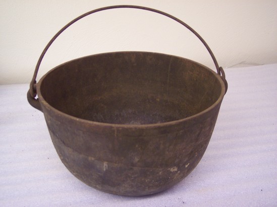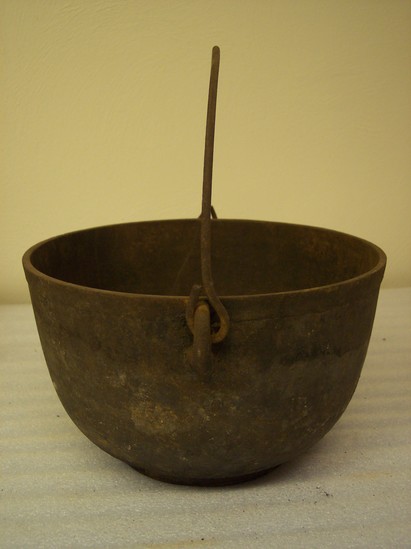 Ring base with rounded bottom coming up to straight sides; plain ring; "C" holds on sides for wire handle