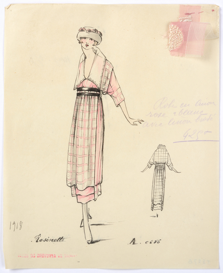 Lithograph and watercolor on paper fashion design. Dress in pink and white fine linen with embroidered fine linen. Fabric samples accompany rendering.