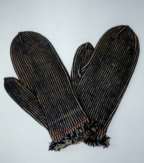 Hand-knitted woolen man's mittens, blue and white vertical stripe, red stripe around cuff, fringe at cuffs. Made by Polly Crampton Filley