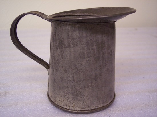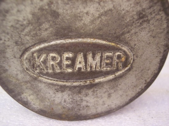 Flaring sides, added lip and handle, seams soldered, edges turned. Marked on bottom "KREAMER"