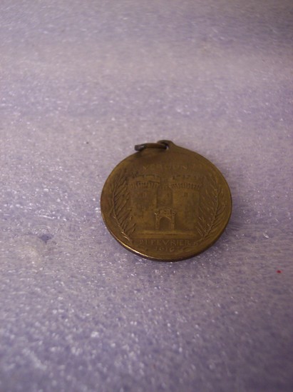 circular brass medal with loop at top; obverse side - "VERDUN" against rayed background above two towered castle above, "21 FEVRIER/1916" with laurel branches on each side. Reverse - bust of lady in war helmet holding sword and looking vengeful, "ON NE PASSE PA" above, Vernier behind helmet