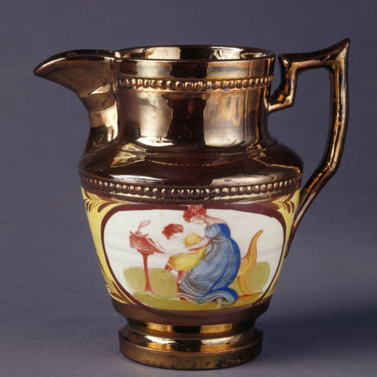 Copper luster pitcher with yellow band on center; one side polychromed transfer print and free-hand painted "The Writing Lesson," the other "Battledore and Shuttlecock" in ovals. Slip base, squared handle, beaded shoulder and collar band, large spout.