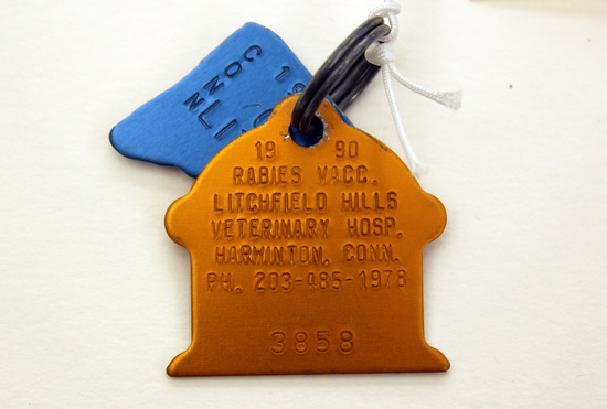 Two metal dog tags (licenses) attached to a metal ring. One is orange and shaped like a squat fire hydrant. It is stamped, "1990/ RABIES VACC./ LITCHFIELD HILLS/ VETERINARY HOSP./ HARWINTON, CONN./ PH. 203-485-1978/ 3858." The second tag is blue and shaped like the state of Connecticut. It is stamped, "1990/ 0947/ LITCHFIELD/ CONN."