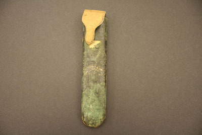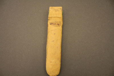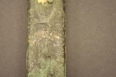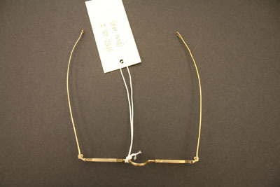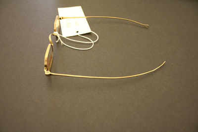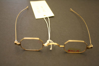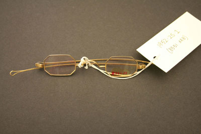 Eyeglasses have small octogonal shaped lenses with brass frames, thin bows with tear drop shaped loops at end. Case is cardboard covered with black leather on front and suede in back. Has a flap top for closure. Stamped on front "Steele & Son/Depot for/Spec's/Hartford, Conn"