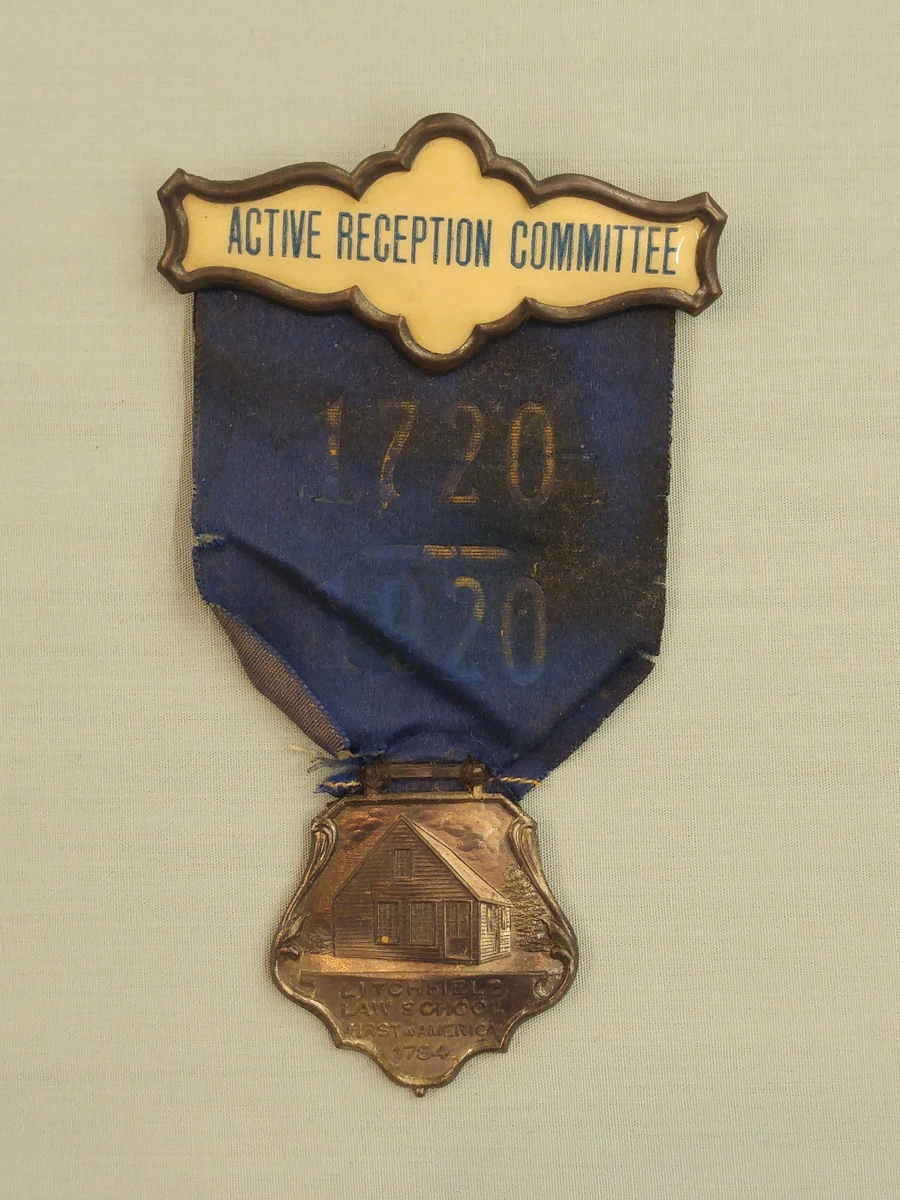 Scroll-shaped pin bar with white enamel center. In blue lettering "Active Reception Committee" Attached to pin bar is blue silk ribbon, in gold lettering "1720/1920". Medal attached to bottom of each ribbon. A: Shield-shaped silver colored medal with image of Law School building on front. Underneath building "Litchfield/Law School/First in America/1784" Writing on back of medal but blue ribbon glued to back so obscuring part of it/ What can be read "Bi-Centennial/August 1st - 4th/1920" B: Round, white, metal pin with enamel on front. Photographic image of Litchfield Law School in center. Printed around image "Bi-Centennial, Litchfield, CT" at top "August 1-4, 1920" at bottom