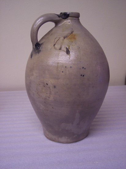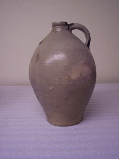 Shaped rim with incised lines on collar. Applied handle at neck. Dark blue glaze at base of handle.