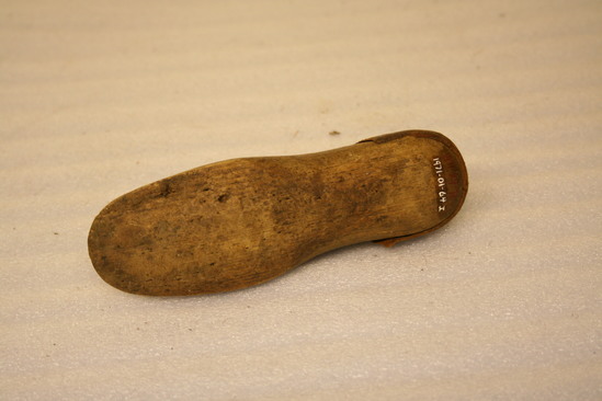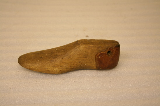 Child's size wooden shoe last. Hole drilled through back of heel. Piece of leather wrapped around heel. Held in place with wooden shoe pegs and iron nails