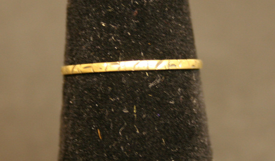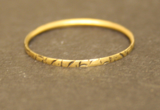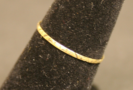 Lady's ring, narrow gold band with bright cut decoration all around.