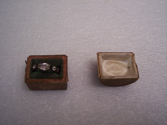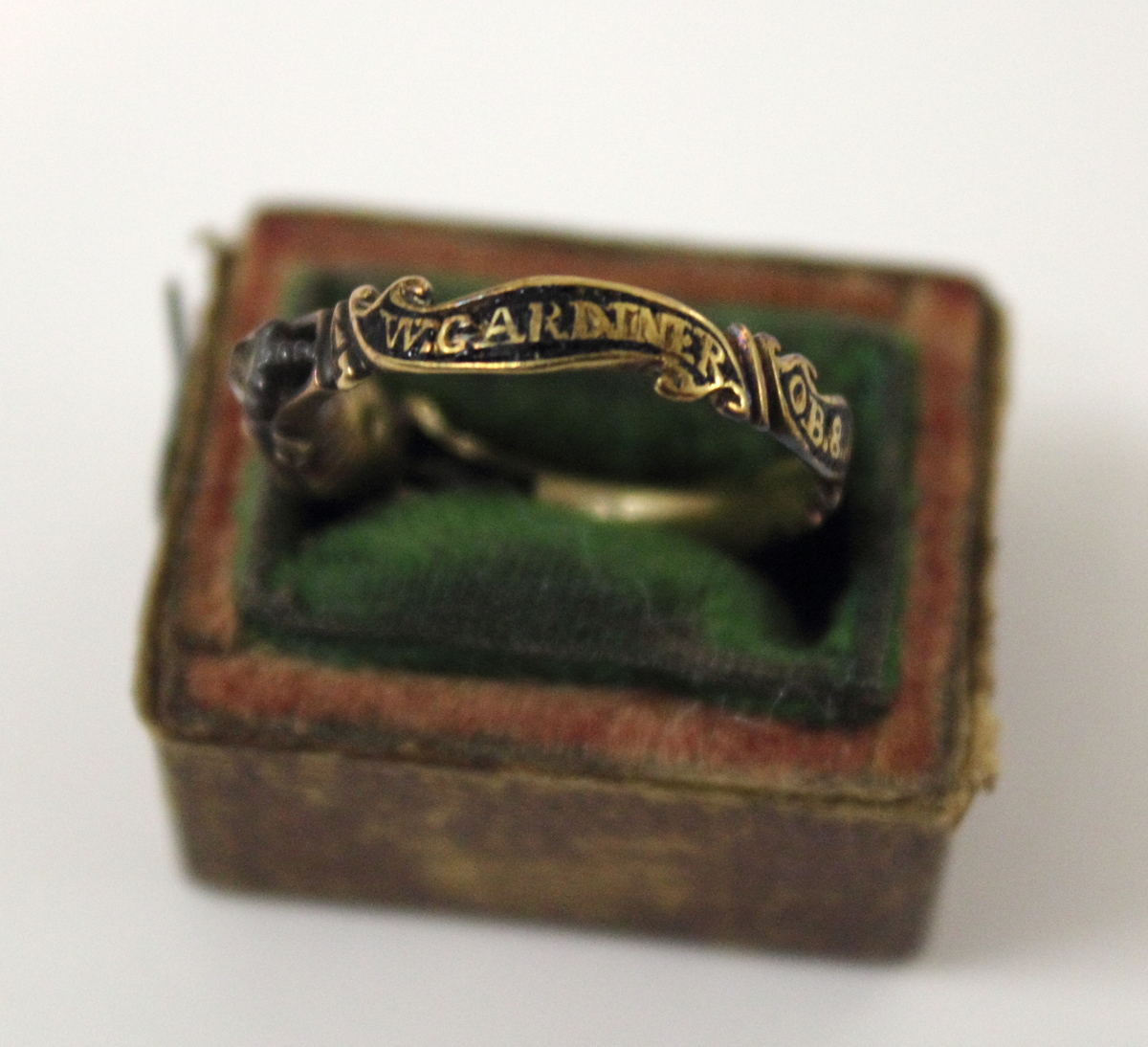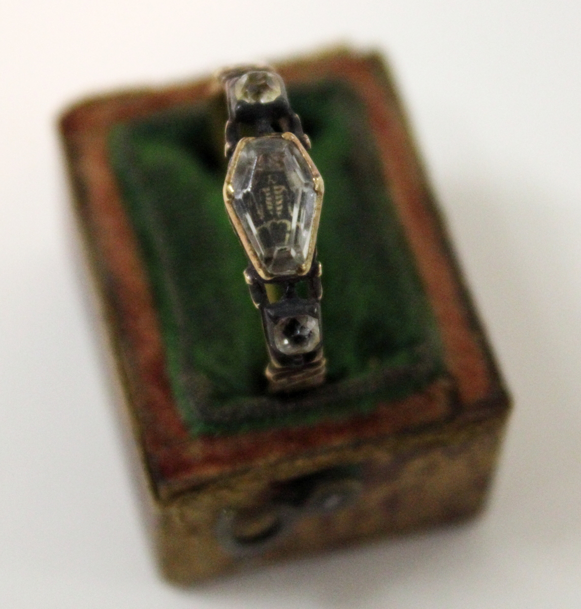 gold ring with loop of three gold and black enamel banners with inscriptions in gold letters "W. Gardiner/OB. 8. June/1766 AE24 Bezel" on either side of center piece is a faceted stone clear in prong and enclosed setting. Center is a coffin shaped faceted crystal with skeleton on paper underneath, prong enclosed base with rays on reverse side. Original box, red leather humped top with hook clasp, white satin lined top and green velvet slotted base.