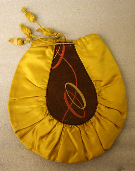 Semi-circular shaped purse of yellow silk. On each side of purse is a thin semi-circular shaped insert of maroon silk with a design of red and yellow swirled lines. Yellow silk string drawstrings at top with small tassels at end of each.