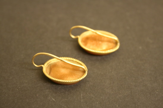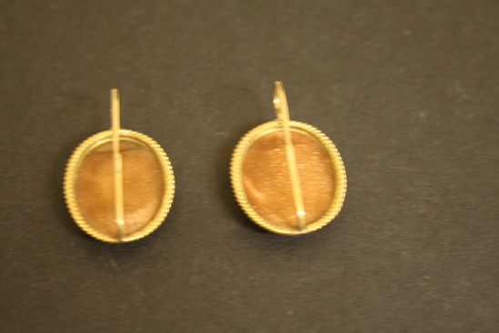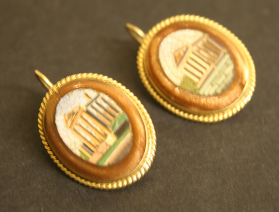 Pair of earrings for pierced ears. Gold wire loop on back of earring. Oval mosaic of Roman ruins with oval band of orange/gold colored stone around mosaic design. Set in oval shaped gold setting with twisted rope border along outside edge.