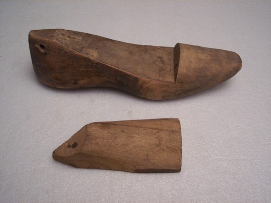 Wooden shoe mold (a) is base of mold - squarish shaped toe which is slighly upturned. High arch. Small square pegs protruding from around base of mold. Hole drilled through heel of mold. (b) is a removeable piece that fits on top of mold. Wooden with two iron nails. Piece has been cut away.