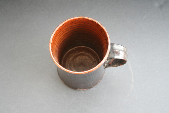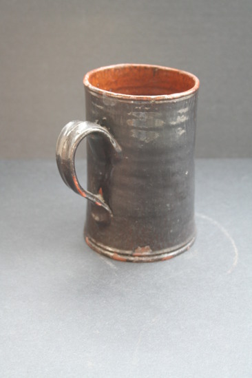 BLACK GLAZED EXTERIOR WITH SPLOTCHES OF GREENISH GLAZE; CLEAR GLAZED INTERIOR. EAR-SHAPED HANDLE, STRAIGHT SIDES. INCISED LINES AROUND BASE.